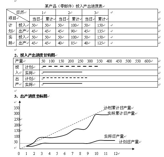 生產作業核算就是在生產作業計劃執行過程中,對產品、零件的實際投入和產出量,投入和產出期,在制品占用量,各單位和個人完成的工作任務等所進行的實際記錄。生產作業核算一般是用圖表的方式表示:如下